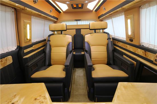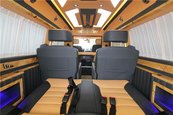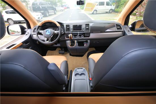 内饰方面:大众凯路威前排的驾驶舱也不是此款改装车的重点所在,中控台上一切都基本与原车相同 ,熟悉的大众设计无需再赘述。要说改变也还是有的,前排座椅变成了真皮包裹,提升了质感。前舱 内饰改变较少主要升级体现在真皮的包裹和配置上,而作为主力的后舱则像是路上游艇一般的奢华。