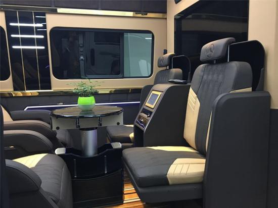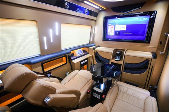 内敛精湛质感,傲视同业标准,领袖精英座驾,卓越不凡人生;进口底盘奔驰斯宾特,蓄势而待,难掩尊崇气度;豪华单人座椅,带8项电动调节功能, 豪华三人座椅,平放可当床, 前舱15L车载冰箱, 40寸三星高清智能电视,豪华中央集成控制系统(10.1寸触摸屏),1500W逆变充电一体机, 4G上网终端,100AH辅助蓄电池(后舱用电), 电动升降桌。