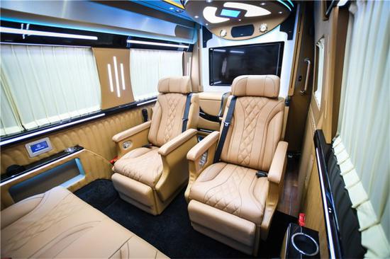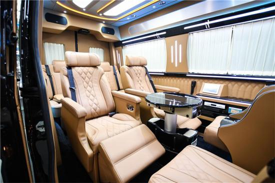 这款奔驰斯宾特7+2:整车采用豪华运动包围、爬梯、轮毂罩,高光泽钢琴漆装饰面板、多功能全隔屏设计、隐藏式吧台椅、中排座椅(按摩、加热、可旋转、六向电动调节)、连排座椅(四向电动调节、可放平)、游艇级柚木地板、可拆卸桌板、高级航海钟、温湿度计、隐藏式电动折叠桌、BOSE高保真音响系统、三星40寸高清电视、前后舱空调独立控制系统、后舱触摸屏控制系统、车载导航、车载卫星电视、车载冰箱(25L)、瑞士奈斯派索咖啡机、索尼蓝光碟片播放器、双电池供电系统、1500W逆变器、外接电源、220V多功能插座。