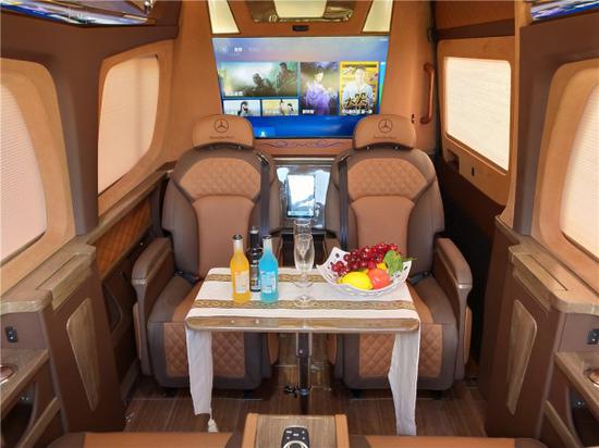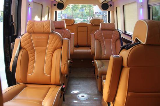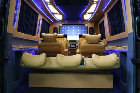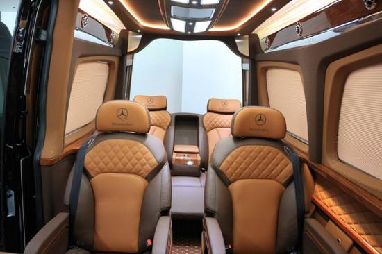 奔驰斯宾特7座曲面吧台版,奔驰S350发动机调校,整车80%磨具化开发,多功能方向盘+氙气大灯;整车前后舱共有20处储物暗格,6处杯托,1处雨伞槽;独有前后双冰箱配置,内饰版采用红柚木高光水转印包覆;前后商务全隔断设计,电视可一键式电动升降,添加了防夹功能;座椅采用进口纳帕小牛皮,独立开发可180°旋转7项调节功能;搭载 5.1声道影院级BOSE音响,车载博世咖啡机;内饰板材兼具防火,防潮,且富有高光泽;全曲面屏多功能组合型吧台,吧台内置指纹保险柜;三联排座椅两侧配备电动隐藏式小桌版,可3种模式开启;车内装载置顶中央空气净化器,首长席侧面有侧窗可开启;第三联排座椅带有双向控制中央集成系统,可控制整车电器设备;整车采用百褶电动窗帘,私密材质环保。每个座位都可独立控制;独有的超大蝴蝶扇窗设计搭配电影《宇宙空间站》中科幻感氛围灯;