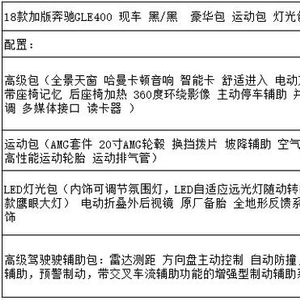 2018款加版奔驰GLE400配置:豪华包( 全景天窗智能卡 哈曼卡顿音响 前后电眼 环车影像加热方向盘 前后座椅加热 导航 电尾门) 运动包(20AMG轮毂及AMG包围 底盘升降 全地形反馈系统 ADS可调式减震系统灯光包(LED大灯自动远光灯随动转向)单选:脚踏 拖钩 冷热杯架 黑色织布顶。