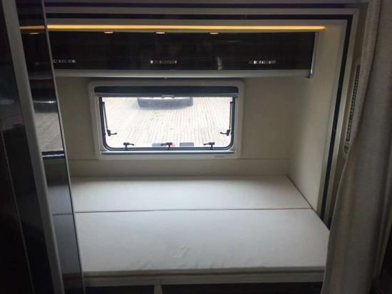 车尾配置双人床,床垫为上等布艺包裹,厚度为三十公分左右,填充物软硬适中,躺下休息十分舒适,上方有光线柔和的阅读灯,无聊时可依靠在床头,阅读杂志打发时间。双人床里侧设置双玻璃窗、下拉式隐私窗帘。上方为储衣柜,呈V字型排列。