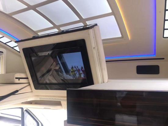 睡眠区三张床驾驶舱顶置大床。车尾大床。餐厅床