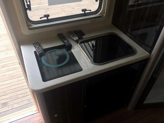 卫生间配置十分齐全,前为坐便马桶、后为淋浴间,上方设计有天窗。淋浴间配有玻璃门,门口处还有高出地面的隔断,可以防止淋浴时水外溅。卫生间外面为洗手池,不锈钢制作,抛光处理,边缘圆润防划伤。洗手池正前方为一面镜子,下方为储物柜。