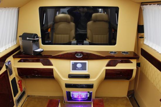 新款大众T6平顶商务房车,整车尺寸5304X1904X1990(可进地下车库),进口底盘2.0T7速四驱,ABT包围,7座(2+2+3),驾驶舱2座,乘客舱2个独立航空按摩座椅可360度旋转,后3人座联排沙发座椅,放平便是沙发床,全车豪华游艇级内部装饰,柚木地板、BOSE音响系统、220V外接电源、胶囊咖啡机、车载专用冰箱、精致吧台+32寸电动升降隔断电视机。