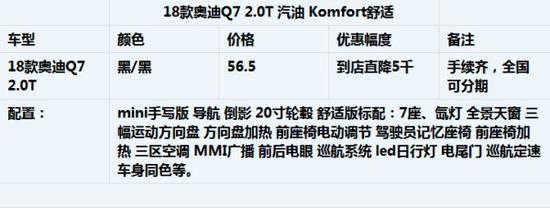 18款奥迪Q7装备了3.0升TFSI机械增压发动机,匹配新款8速tiptronic变速器。最大功率333马力,最大扭矩440牛米,0-100公里/小时加速时间6.2秒。3.0升TFSI的缸内直喷技术与轻量化曲轴箱,加上集成了quattro中央差速器的变速器是全新奥迪Q7动力系统高输出,低能耗的关键,平均百公里油耗9.1升,这在细分市场是个领先数字。另外有搭载了2.0 TFSI发动机的车型,这款发动机最大功率252马力,最大扭矩370牛米,驱动经过减重300多公斤的Q7也显得很从容。