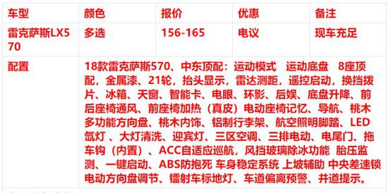 近日获悉,2018款雷克萨斯LX (配置|询价)570天津港现车优惠,最畅销豪华SUV降价热度居高不下,新款凌志越野本性彰显,配置功能全面介绍,外观霸气内饰豪华,纯爷们追爱车型,酬宾福利享不停,邀您来选车。雷克萨斯LX570目前分为:中东版和加拿大版,与中规版,今天我们来到天津运泽汽车贸易有限公司给大家讲解一下中东版雷克萨斯LX570铂金版都有哪些配置及优惠。