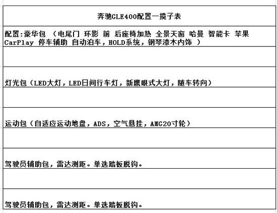 2018款加版奔驰GLE400配置:豪华包( 全景天窗智能卡 哈曼卡顿音响 前后电眼 环车影像加热方向盘 前后座椅加热 导航 电尾门) 运动包(20AMG轮毂及AMG包围 底盘升降 全地形反馈系统 ADS可调式减震系统灯光包(LED大灯自动远光灯随动转向)单选:脚踏 拖钩 冷热杯架 黑色织布顶。