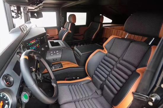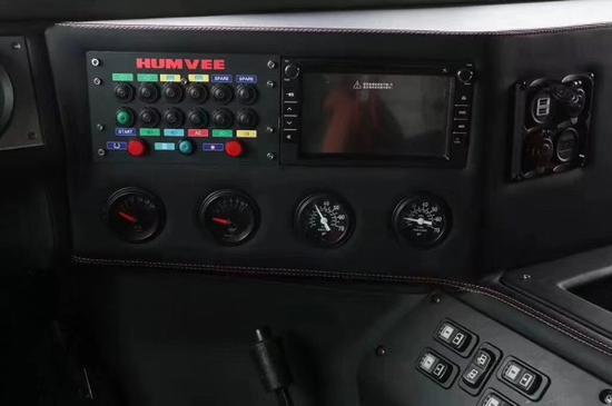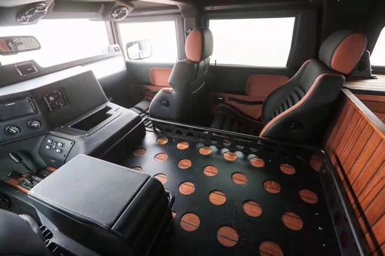 相对于军用的HMMWV,Humvee最大的改动就是内饰:为了增加舒适性和包裹性,前后座椅都改成了专门订制的赛车座椅;为了改善握感和操控性,方向盘改为欧洲进口的momo赛车方向盘;为了增加视觉和触觉上的豪华感,车内也采用了大量的皮革和实木材质来覆盖。不过刨去这些改动,我们还是能从车内的整体结构中看出原先军车的样子,特别是中控台更是让人想到了坦克、军舰内部的景象。虽然Humvee从外观上来看非常魁梧,但是为了增加底盘高度同时尽量降低车身高度,