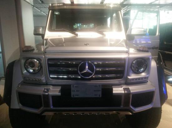 奔驰G500 4x4前保险杠采用与G级AMG车型采用了相同的设计,保险杠下部增加了镀铬下护板,车顶增加了可拆卸的碳纤维扰流板,并在扰流板两侧融入了LED灯光系统。此外,由于新车轮距进行了加宽,因此与普通版G 500相比,奔驰G5004x4概念车的四轮轮眉宽度有了明显的增加,黑色的碳纤维轮眉也赋予了整车更为强悍的野性。
