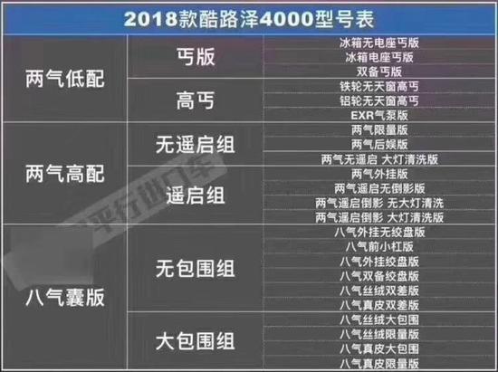 酷路泽4000的型号,分为两气囊和八气囊两种。其中,两气囊又分为低配“丐版”、中配“高丐”和高配三种;而八气囊则只有高配一种,不存在中低配。所以,两气囊加八气囊一共四种档次,有超过20个型号。平行进口版18款丰田兰德酷路泽的型号命名方法,跟弟弟霸道不同,霸道是以前用国家版本来划分的,比如迪拜版、阿曼版等等;现在则是用两气囊九气囊底挂后挂是否带天窗来区分。而酷路泽,车商们则直接用配置特征来划分,比如大灯清洗版、气泵版等等。