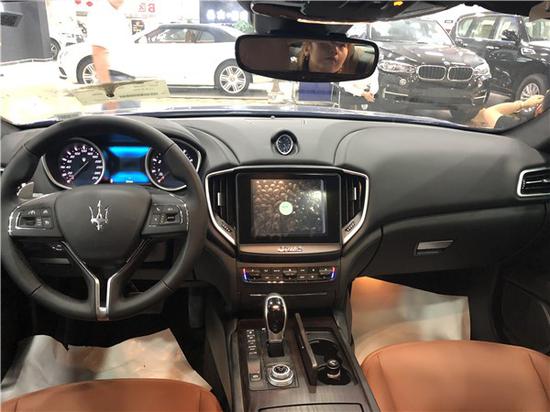 18款玛莎拉蒂 Ghibli (吉博力)S内饰由奢华真皮包裹,仪表盘的设计技术为核心,简洁利落,后视镜采用深色金属光泽装饰,仪表台的两侧面板向中央汇合,勾嘞出简约优雅的中控台,中控台上方还有时钟,下方设有8.4英寸触摸屏。