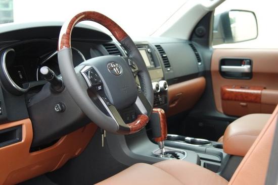 18款丰田红杉内饰上简朴大气,但是舒适感十足,真皮座椅就好像是“移动的大沙发”,宽大,厚实,但让人不可忽 视。中控台的设计很人性化,黑色的中控,搭配金属色按钮包围,再用木纹座装饰,让整个内饰多了几 分高贵豪华。前后座椅加热和前排座椅通风,并且带有吸顶DVD和JBL高级音响的组合,让乘坐着倍感舒 适惬意。配置方面:5.7L、7座全尺寸SUV、20寸轮毂、雷达测距(ACC自适应巡航)、并道辅助、2/4驱切换、空气悬挂、底盘升降、车身稳定控制、中央差速锁,后桥限滑差速器、吸顶DVD、前座椅通风加热、前座椅电动调节及座椅记忆、第二排座椅加热、主副驾驶腰部支撑、主驾驶腿部支撑、第三排电动座椅、三区自动恒温空调、巡航定速、桃木方向盘、触摸式导航屏、倒车影像、前后电眼、4CD、JBL高保真音响、电动尾门、后排隐私玻璃、全景天窗、脚踏板、行李架、拖钩、皮遮物帘。
