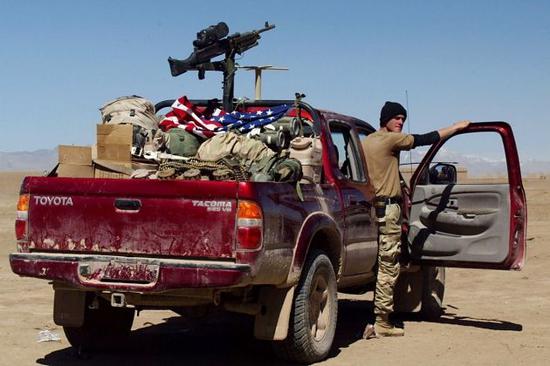 海拉克斯!这款车我们经常在美国大片中见到。真正让海拉克斯封神是在1987年的叙利亚战场上,话说在1987年,西方国家看不下去叙利亚一直受欺负,支援了叙利亚一批丰田小皮卡,一看,呀!这车不错,扛豁耐造还好看,利利索索的拉着车就上了战场!叙利亚的士兵慌了,坦克没有,战车没有,就给辆小皮卡,这怎么打 不能直接开着去撞人家吧!考虑了好久(也可能就一根烟的功夫)之后下了一个很大的决定:所有武器都往皮卡上装!机关枪,装!火箭弹,装!人也往上装!