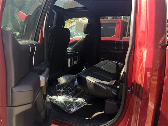 18款福特F150XLT版标配皮卡的内饰采用独特的中控台和门饰板面漆和真皮包裹的方向盘,中控功能区域可分为三个小控制区,最上端为音响控制及导航控制,中间为收音机调节控制,最低端为空调及座椅加热控制。