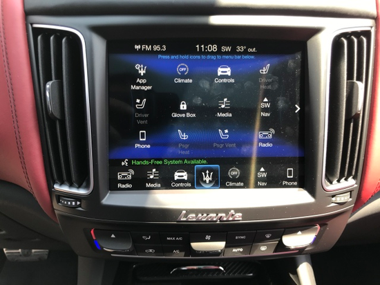 18款美规玛莎拉蒂SUV莱万特配备的一套从玛莎拉蒂触控系统(MTC)演变而来的人机交互系统提供了更多的功能和便利:其8.4英寸的高分辨率电容式触控屏,除通过触控系统外,还可通过位于中央通道上的全新控制旋钮进行控制。该车配备的驾驶辅助系统还包括兼容自动启停功能的自适应巡航控制系统、前方碰撞预警系统、自动制动辅助系统和车道偏离预警系统等。此外,新款莱万特系列标配了电控可变阻尼空气悬架系统、巡航控制、玛莎拉蒂稳定性程序、陡坡缓降、坡道起步辅助、电子驻车、胎压监测、电动尾门、前排座椅加热、天鹅绒地毯、全景天窗、主动换挡拨片等。其中,高配车型莱万特S还配备有升级版皮革内饰、自适应大灯、大灯清洗等配置。