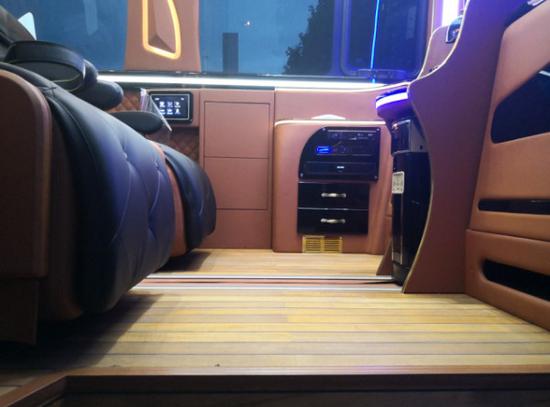 奔驰斯宾特的内饰座椅配色十分美观大气,两个全自动隐藏座椅,一个全自动吧台可以供乘客打牌娱乐,另外吧台的桌面也是真皮铺设的,非常美观结实耐用。奔驰斯宾特前排座椅为航空机按摩座椅,可以360度旋转,将后排座椅放平之后就是可以供3个成年人休息的床铺啦。休息之余还可以按摩放松,缓解您的乘车疲劳。奔驰斯宾特车内大面积真皮包裹,前后排座椅均可向后大角度放倒,方面躺着休息,前后排均有触控屏幕,电动窗帘、全自动隐藏吧台、可升降高清液晶显示器、boss音响等等通过控制屏均可操作,另外还配备了可拆卸的办公桌。可办公,可娱乐,可拆卸——节约空间的同时也提高了乘客舱的高逼格。