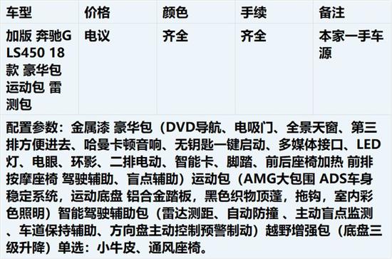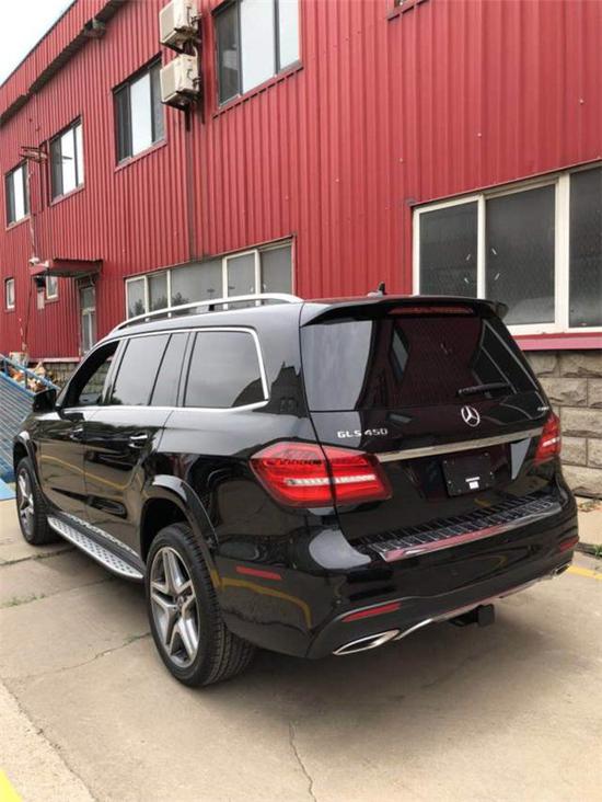 18款加版奔驰GLS450配备7档手自一体变速箱,5门7座型SUV,加版,美规版GLS450发动机与中规版的发动机不同,中规版输出马力为333匹马力,而原装进口美规版和加版的发动机输出马力则达到362匹马力,采用承载式底盘。更适合于七座车的乘坐,车身长宽高尺寸为:5120,1934,1850(加版带有AMG套件的尺寸则为:5146,1982,1850)前后采用AIRMATIC自适应空气悬挂,主动底盘升降。