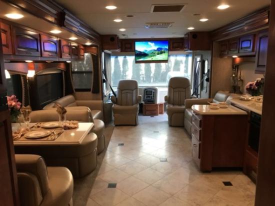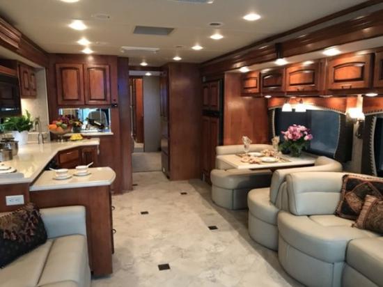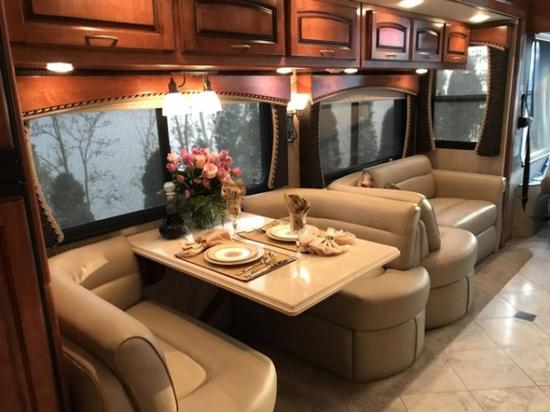 它车长13.66米,车宽2.55米,车高3.81米,自重9吨,搭载了一台12.972L的康明斯直列六缸柴油发动机,三桥底盘设计,内部两室两卫一厅设计