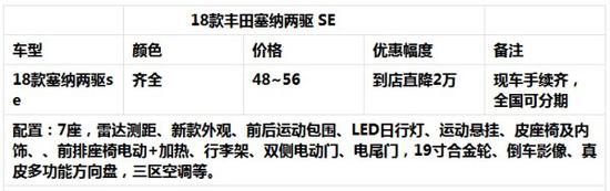 天津《金翔国际》汽车贸易有限公司,直营进口车全系。本公司资产优质,实力雄厚,信誉良好,金秋迎佳节18款丰田塞纳两驱,四驱各种版本大量现车到店,进店限时秒杀降价2万优惠不断,配置手续均齐全,详情请见下方联系方式。凭此文章截图进店送礼包。