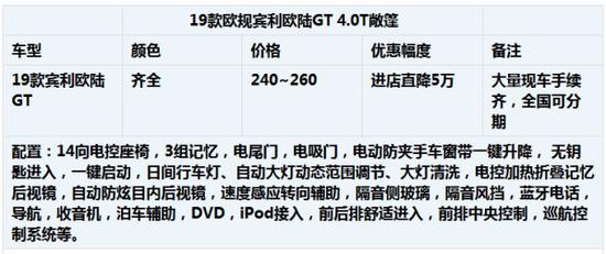 19款宾利欧陆GT4.0T这个排量主要以敞篷为主,4.0T排量。五百零七匹马力。8档手自一体。2门4坐软顶敞篷车,*车速(km/h)三百。官方加速(s)5.00。。轴距是两米七六。整车质量两千公斤。油箱容积90L。行李箱容积两百六L。双涡轮增压进气模式。*功率(km)三百七十三。。*功率转速(rpm)六千。。*扭矩(N.m)六百六。。*扭矩转速(rpm)一千七。。采用的是自动变速箱。前置四驱驱动方式。全时四驱形式。凭此文章截图进店直降5万