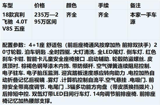 2018款宾利飞驰V8S 4.0T双涡轮增压,528匹马力,V8发动机,8速变速箱,百公里加速4.9S,功率为388KW,680牛米。四轮空气悬挂,长*宽*高为 5295*1976*2425(mm),18款宾利飞驰V8S双边双出尾排露出部分有镀铬装饰,凸显力量感的同时又不失稳重。