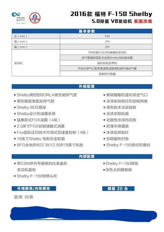 新款福特F150 shelby谢尔比 5.0排量VB发动机美国改装基本参数 长(mm)594 宽(mm)256 750匹超大马力机械增压发动机 进气管福特蓝粉末涂层 Shelby刻输油管 发动机 风机和皮带轮 开放式进气口配有高速油质嘴和碳杆维进气管铝制热交换腾 外部配置 Shelby调校的 BORLA高性能排气管 聚碳酸酯机盖和双进气口黑色陶瓷表面双排气管 涂漆前保险杠和定制网格 Shelby BDS悬挂 黑色粉末涂层踏板 Shelby设计的减震系统 涂漆定制轮眉猛禽款式FOX减震(4轮功能性涂漆挡泥板 2.5英寸F○X铝制储藏式减震 防滑车牌置换际回技术可调式双速度控制(4轮) 涂漆后保险 8英寸 Shelby蚀刻合金轮毂后箱盖和衬垫 BFG全地形K0235/12.50R18英寸轮胎 Shelby F-150条 内部配置 带CSM序列号徽章的仪表盘和 Shelby F-150脚垫 发动机盖板 深色太阳膜玻璃 a Shelby F。-150剩绣头枕