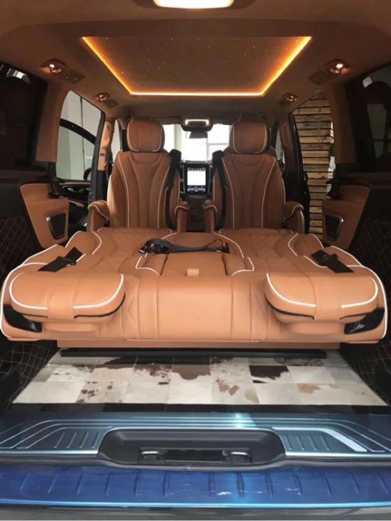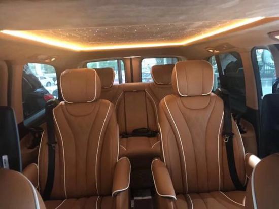 奔驰V-class氙灯,日间行车灯,车身镀鉻饰件,不锈钢迎宾踏板,侧窗推拉窗,日本奥斯维进口鹿皮内顶,内部氛围灯,星空顶灯,4寸灯光控制触摸屏,高级真皮打孔座椅,纯牛毛缝制地毯,高级实木烤漆内饰,内部镀鉻套件,12.3英寸导航屏,双头枕后排娱乐系统,12L温控冰箱,旋转式迈巴赫航空座椅(通风、加热、按摩),三排电动沙发床,二排折叠式办公小桌板,倒影,19寸铝合金轮毂,双侧电动门,对开式尾门,并道辅助,多动能真皮方向盘,后视镜转向灯
