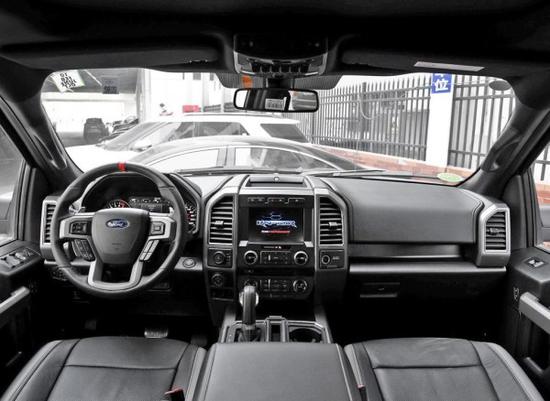 福特猛禽F150内饰采用独特的中控台和门饰板面漆和真皮包裹的方向盘。中控台部分辅以银色饰板装饰,六指针仪表盘的设计有些后工业时代的复古风格。采用带电冷热功能的可记忆式皮革座椅,头枕四向可调,搭配铝饰条和黑色钢琴烤漆内饰。可电动升降的后窗带隔板和电热除霜功能。