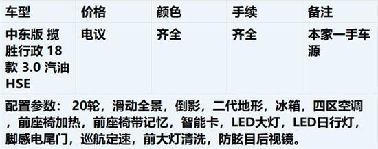 18款路虎揽胜行政3.0汽油版3.0T V6发动机,8速变速箱,尺寸4999*1983*1867mm,最高车速280,百公里加速6.5s,综合油耗10L,轴距2922mm,油箱容积105L,最大功率250,最大功率转速6500,最大扭矩450,最大扭矩转速3500-5000,新车采用非常炫目的隐藏式换挡杆,在发动机启动后,换挡旋钮可自动升起。18款路虎揽胜行政的前后悬挂为空气悬挂,并配合第二代地形反馈系统,将奢华与越野的完美结合体现得淋漓尽致。