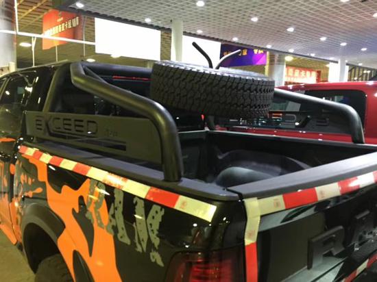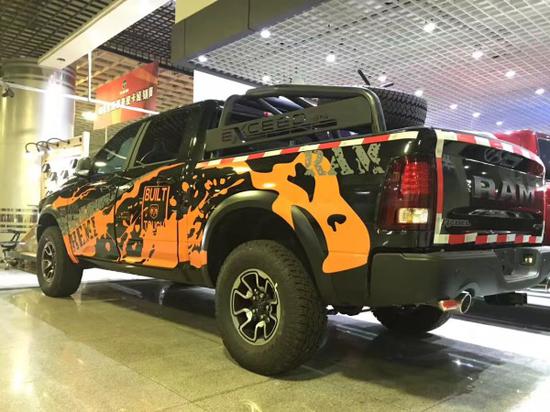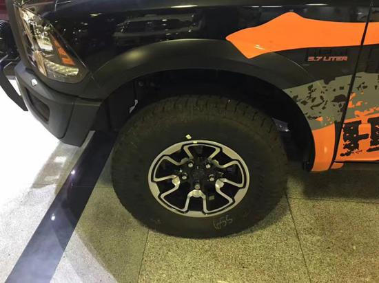 2017款道奇公羊叛逆者皮卡其他方面:换装17英寸黑色亚光合金轮毂和东洋Open Country A/T全地形轮胎。尾箱门冲压出RAM标徽,配备大口径双筒镀铬排气管。