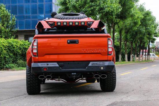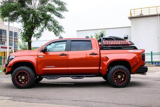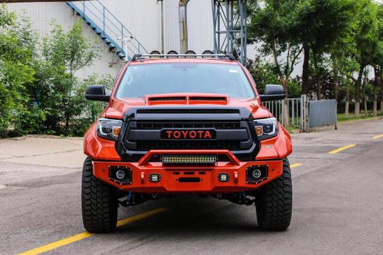 丰田坦途SR5TRD改装版长途旅行越野代步工具,它受到一度追捧的原因在于它的多功能性,集合了SUV的越野性能、卡车的载货能力、以及轿车的舒适性,丰田坦途SR5TRD同样具有其它皮卡所具有的肌肉派风格,但是性价比却高于其它款式,丰田坦途新车5米8的长度,这样的尺寸坦途不仅在公路上能独当一面的风光,在停车位上可能也得需要额外的照顾, 内部装饰更接近SUV车型,木质的应用让这辆卡车拥有了几份细腻典雅的感觉,人也足够震撼,看似粗犷实则多了几分秀美,让整部车看上去略显轻盈之态。