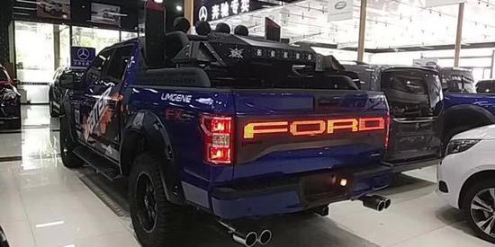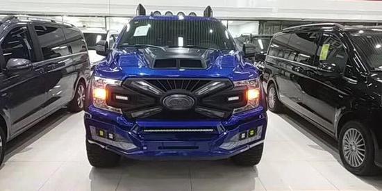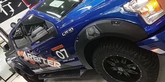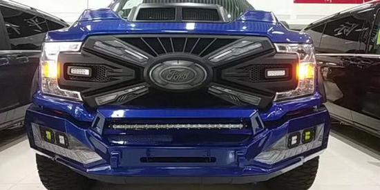 全新福特猛禽F150方方正正的前大灯与前保险杠造就了完美的车头造型与比例,进气格栅采用蜂窝状网格设计,并配以雕刻式的福特品牌标识。其前保险杠相当硬朗,且保险杠下方配备金属护板,以应对极端路况环境。整体的车架由高强度钢冲压而成,这样不但提高了车身的耐用性,更对乘客在安全方面有了进一步的保证。