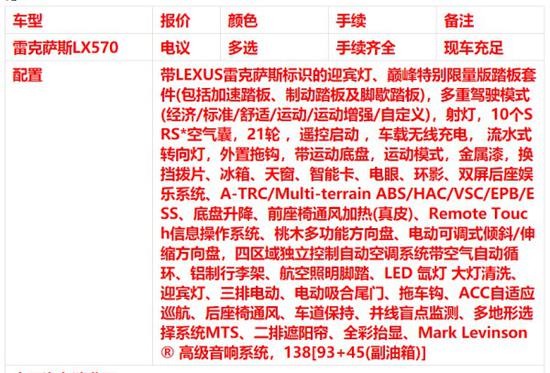 近日获悉,天津运泽汽车贸易有限公司新到18款雷克萨斯LX570多台颜色齐全价格方面极大优惠。