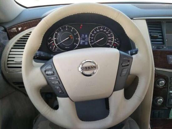 尼桑途乐 Y62 的内部做工采用大范围真皮包裹和木纹面板装饰,并以金属饰条点缀。方向盘较大,但是握感还是很舒适的,越野中不会拖你后腿。黑底白字的仪表显示清晰,行车电脑可以显示丰富的行车信息。
