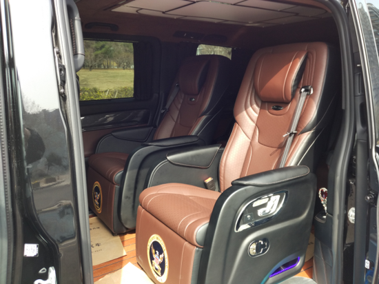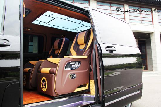 原色ABS材料保证了车内无异味、阻燃V0标准比国标还高一级别呢;外观全部采用AMG套件,19寸AMG轮毂,全段双边四处AMG排气;空气悬挂不仅增加了乘坐的舒适性,还能任意调节车辆高低度,大大提高了转弯幅度和增加了刹车效果,更比埃尔法的刹车距离缩短了10米、10米啊;整车UV玻璃,有效的防止98%紫外线的照射,同时还提高了节油度呢;座椅采用了个性化冲孔的蒙娜丽莎12项电动调节座椅,LOGO刺绣光鲜亮丽,还增加了一键复位功能,记忆功能,电动头枕和更加舒适的二级腿托;车内采用整张的巴西牛毛虎皮地毯,彰显奢华,配着太空舱色度可调的顶灯,别具一格;雨伞更体现了人性化的设计,而且雨伞盒里带有导水槽,不会把昂贵的地毯弄湿的