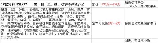 18款宾利飞驰V8S参数:长×宽×高(mm)5299×1984×1488,轴距(mm)3066,4.0TV8双涡轮增压,最大马力(PS)528,最大扭矩(N·m)680,8挡手自一体,最高车速(km/h) 306,官方0-100km/h加速(s)4.9,油箱容积90L,后备厢内部尺寸(mm)1230×1000×460,前置四驱,全时四驱,托森式差速器,前双叉臂式独立悬挂,后多连杆式独立悬挂,电子液压助力,承载式车身,通风盘式,电子驻车,轮胎规格275/40 R21。