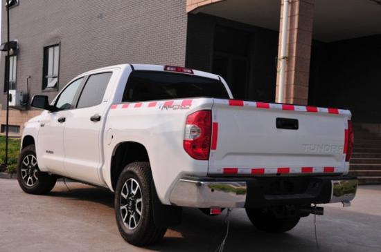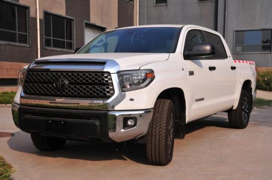 2018款丰田坦途SR5版皮卡外形设计具有明显的美式风格,宽大的进气格栅几乎占据了整个车头部,与边角略微上扬的车灯组成了近似牛头的图案。2米左右的车身宽度和高度造就了整体高大威猛的态势,采用了用于雷克萨斯顶级SUVLX570相同的5.7LV8发动机,拥有401N·m的最大扭矩,动力极为滂湃。