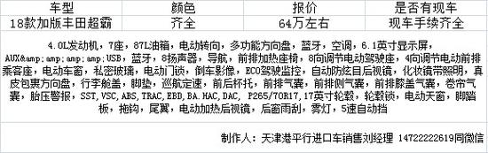 2018款丰田超霸4.0L加规版天津港平行进口车报价行情,平行进口18款TRD越野版现车优惠巨献64万左右报价,有购车意向的车友可致电经销商前来公司咨询。联系电话及公司地址见文章尾部!!