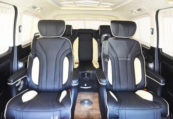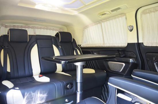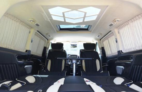 整车内饰采用Alcantara面料打孔真皮配以钢琴烤漆实木处理,天窗,Vclass大灯,日间行灯, Vclass尾灯,电动折叠后视镜,双侧电动门,集成转向灯后视镜,行李架、整车镀铬装饰,脚踏板、镀铬防擦条,Vclass中网,六宫格顶棚灯,行云流水包覆 ,实木地板,打孔真皮+钢琴烤漆实木方向盘,真皮中控台,V-class 流水式中央扶手箱,打孔真皮座椅,烤漆实木装饰,12.3英寸多功能导航一体机,倒车影像 ,车载12L温控冰箱,灯光触控系统,车载辅助充电,折叠小桌板,二排打孔真皮S级航空座椅带有加热、通风、气动按摩、180旋转功能, 三排打孔真皮折叠座椅,180度电动沙发床,行政会议桌,双头枕DVD,前后大包围,后掀尾门。
