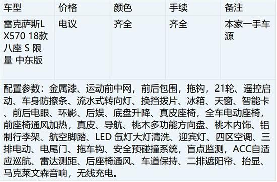 平行进口中东版18款雷克萨斯LX570八座S限量现车港口价格靠谱,18款雷克萨斯LX570车型对于雷克萨斯的重要性不言而喻,可以说是品牌发展历程中最为畅销也是最为赚钱的一款车型,对于这样一款顶梁柱,雷克萨斯自然不会吝啬将最先进的技术装配在它的身上,所以我们能够看到全新LX570车型,在蜕变中完成了又一次自我的提升,在内饰设计方面,引入了更多先进的科技配置,以及多媒体功能,而重中之重则是底盘方面的变化,使其在运动型SUV这一方面越走越远,或许这也正好契合雷克萨斯的品牌传承