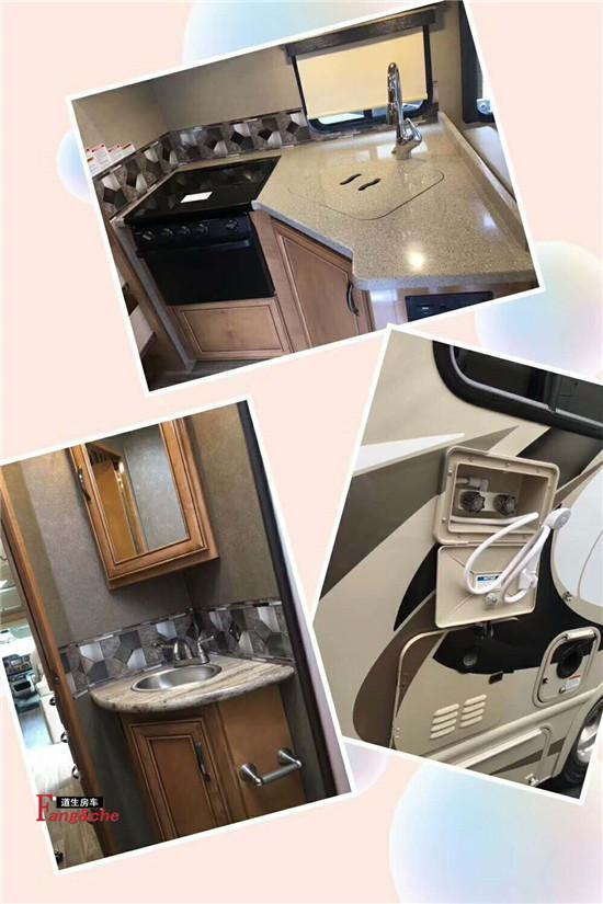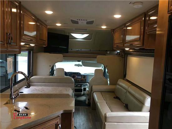 进口福特E450家具用条纹实木制作,简约时尚清新美观,其中左侧为婉约时尚的沙发,右侧为古朴美观的小餐厅,客厅采用的是26英寸LCD液晶电视。房车前部、两侧、尾部均有外推式中空玻璃车窗,具有很好的通风性,同时还有一定的遮雨作用。薄厚两层窗帘使车主可以自由搭配车内光线。
