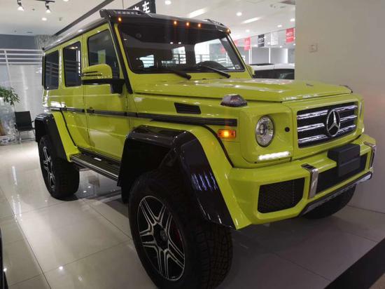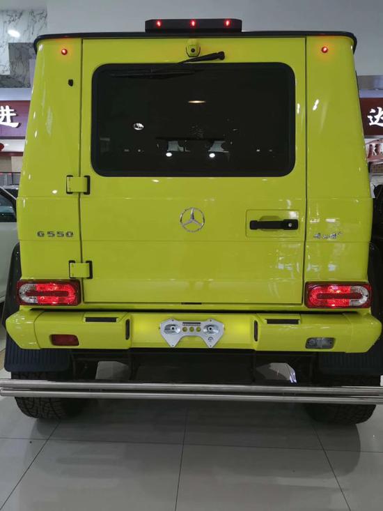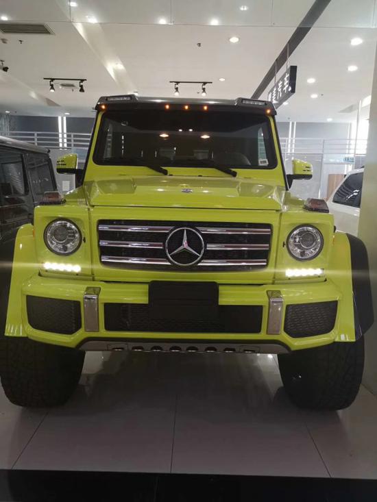 17款奔驰G550 4x4²柠檬黄/黑345离地距离 450mm、涉水能力 1米、轮胎间距 1.744mm、3把差速锁、22寸轮毂、每个轮胎带有两个减震器及两个悬架弹簧单天窗、22轮、红卡钳、双减震、氙灯LED日行灯、多轮廓电动包裹座椅、翻毛皮内饰(翻毛皮双色座椅、翻毛皮方向盘、翻毛皮门板、翻毛皮内顶)、前排座椅通风加热、二排座椅加热、哈曼音响(14个扬声器)、中控碳纤维装饰、碳纤维轮眉、底盘舒适度调节、脚踏、前电眼、倒影、导航、多功能方向盘(蓝牙、换挡拨片)、隐私玻璃。