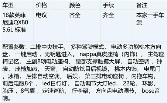 2018款英 菲尼迪QX80车身始终给人一种霸气外露的感觉,以卓越的公路驾驶表现、出众的越野能力,次次谱写顶级豪华SUV的新标准。英菲尼迪Q80不惧怕任何对其 速度的挑战,刚劲有力的士气足以让街旁“战士们”闻风丧胆。纯正的美国血统,让这台充分展示了凶悍外形、身材庞大的大型奢华SUV风靡全球,对于乘坐舒适 性和彰显高贵气质的豪华配置,英菲尼迪QX80丝毫不含糊,绝对不给任何留下批判的机会,就是这么霸气,这么咄咄逼人!