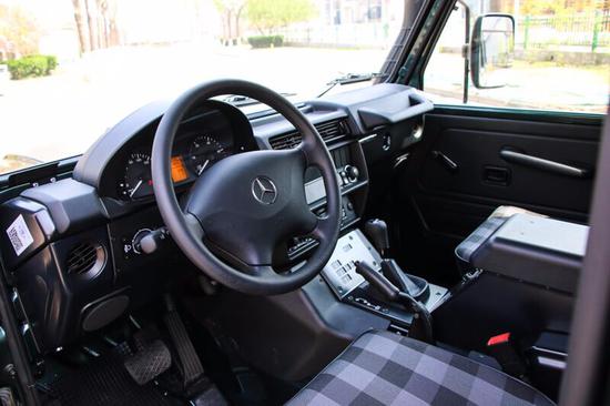在内饰方面,G300依然将实用的理念延续到底,整个内饰设计朴实,各个功能区域清晰明了,很好的传承了G系列的经典设计。改装奔驰G300一改民用豪华、高贵的设计,而是采用将实用性进行到底的设计理念。在仪表台区域,G300采用传统机械式指针设计,可以显示速度、转速、水温与剩余油量。值得注意的是,作为一款柴油车,G300转速表最大值达到了7000rpm。方向盘采用真皮设计,没有多余的按键。可喜的是,奔驰G300配备了方向盘安全气囊,为驾驶员提供安全。