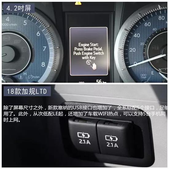 加版屏幕升级的同时,还全系增加了手机导航映射功能。而美版在2017款时就有手机导航映射,只有低配的L没有,2018款L也给配备上了。美版新款塞纳,虽然在中控屏尺寸上不及加版,但在行车电脑屏上扳回一城。美版把低配LE和L的3.5吋行车电脑屏,也升级成了4.2吋,全系统一。而加版则没有升级,仍然只有高配SE、XLE和LTD是4.2吋。