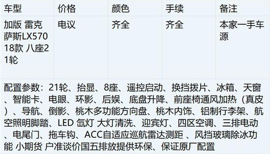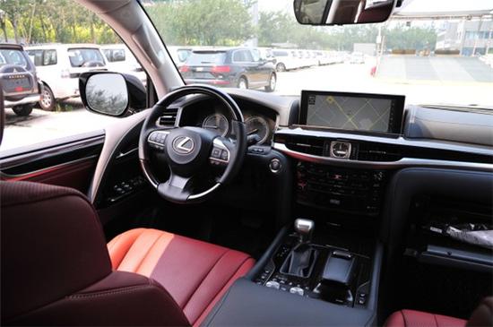 18款雷克萨斯LX570车内精致奢华,舒适至极。实木三幅式方向盘兼具温润触感与典雅质感,真皮部分可在短时间内加热。木材的纹理与质感,打造独具匠心的别致细节。精心鞣制的半苯胺高级真皮座椅,皮质专家花费数月的等待和甄选,只为令您在触摸瞬间尽享非凡质感。出色的仪表盘架构,配以豪华而先进的设计,莹亮的光电子仪表盘清晰易读。4.2英寸的综合信息显示屏,让信息一目了然。12.3英寸高清晰液晶屏应用防反光技术,同时配备SD卡地图导航、带语音识别的雷克萨斯导航系统。