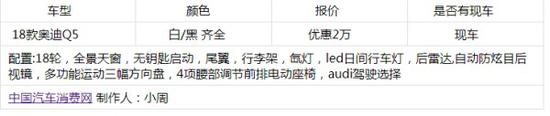 18款新款奥迪Q5整车尺寸为为4660*1890*1660mm,轴距2820mm,总体比上一代稍大一些,造型上更具流线性。以及前脸也有改动,进气格栅设计则更改为Q7横向样式,仅看前脸俨然就是缩小版的Q7。整车经由过程高刚性钢材以及铝材质的运用,到达了“减肥”的效果,车重最多减了90千克,这有助于降低油耗和增添动态行车表现。更多优惠请致电天津远洋恒信国际贸易有限公司 !