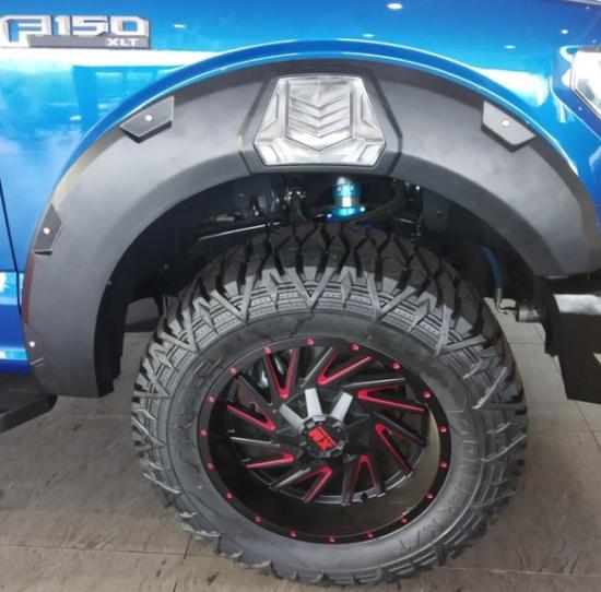 18款F150猛禽3.5TT的进气格栅采用蜂窝状网格设计,并配以雕刻式的福特品牌标识。其前保险杠造型相当硬朗,且保险杠下方配备金属护板,以应对极端路况环境。并且,配备LED日间行车灯,以及17英寸铝合金轮圈与全地形轮胎。