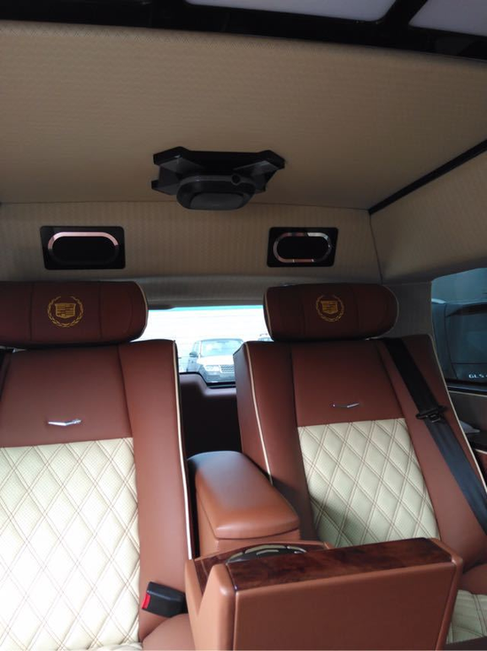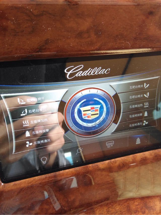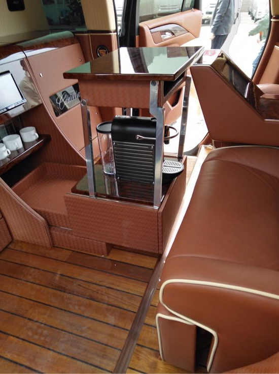 18款凯迪拉克总统一号隐藏六座商务车内饰部分:舱内隔断:可升降分隔屏,32寸超薄液晶电视 音响设备:BOSS环绕音响,DVD 舱内灯饰:氛围灯 LED灯饰,迈巴赫棚顶灯 舱内吧台:酒柜 咖啡机舱内桌板:电动隐藏式伸缩桌板 地板材质:柚木地板 舱内天窗:全景开启式大天窗。